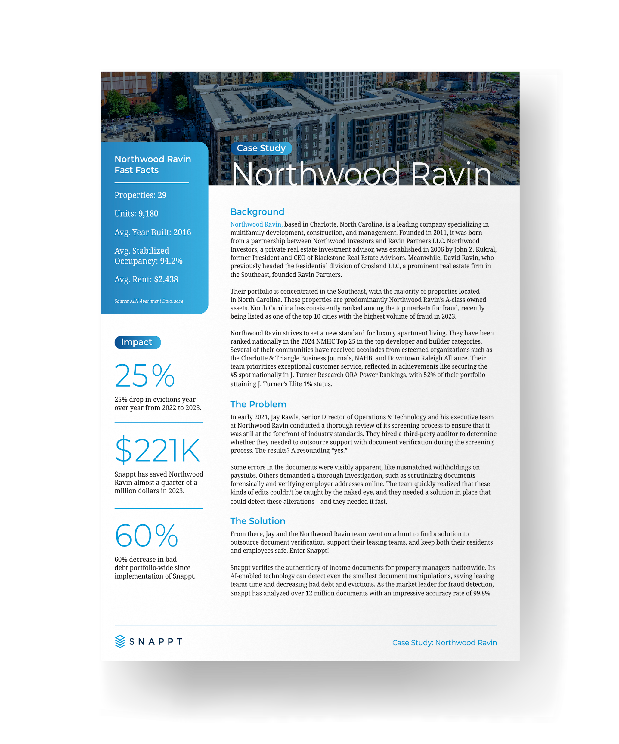 As Northwood Ravin searched for a solution, they came across Snappt. In this case study, discover how Snappt helped Northwood Ravin significantly reduce fraudulent applications and improve its overall leasing process.