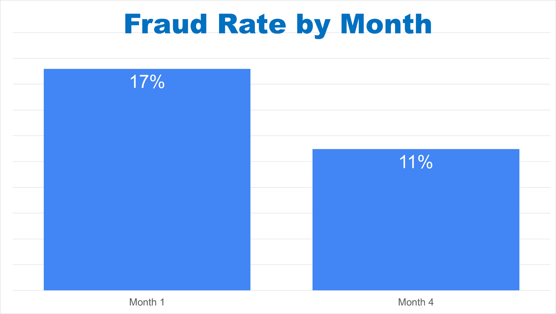 My hunch was that there would be an ADT effect. To confirm this, my research team created a table of all of our clients and management companies (nearly 3,000 properties in the US) that included the tenant fraud rate we saw over time: